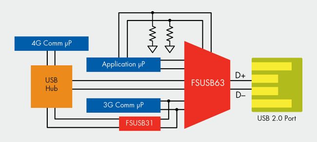 4G手機(jī)的最新趨勢(shì)是在手機(jī)中集成兩個(gè)處理元件,同時(shí)訪問(wèn)USB端口。對(duì)于這種應(yīng)用,一個(gè)比較好的選擇是采用集線器。不過(guò)麻煩在于USB集線器的接線通常是電容性的,功耗相當(dāng)大;而另一方面,同時(shí)訪問(wèn)USB端口的機(jī)會(huì)又不多。圖2所示為這種手機(jī)的一種設(shè)計(jì)方法,其中,3G通信處理器必需與4G處理器分開(kāi)來(lái)單獨(dú)訪問(wèn)USB端口。通過(guò)一個(gè)隔離開(kāi)關(guān)(FSUSB31),并采用極短的PCB引線,可以盡量減小電容。這樣一來(lái),在從3G通信處理器到USB主設(shè)備的路徑上,一個(gè)高速發(fā)射USB數(shù)據(jù)眼(data eye)與USB規(guī)范相比有很大的裕量。在這個(gè)例子中,應(yīng)用處理器控制USB 3:1多路復(fù)用開(kāi)關(guān),當(dāng)后者在待機(jī)模式下處于低電狀態(tài)時(shí),它可以讓自己的控制線路上的上拉和下拉電阻連接到默認(rèn)的應(yīng)用處理器。