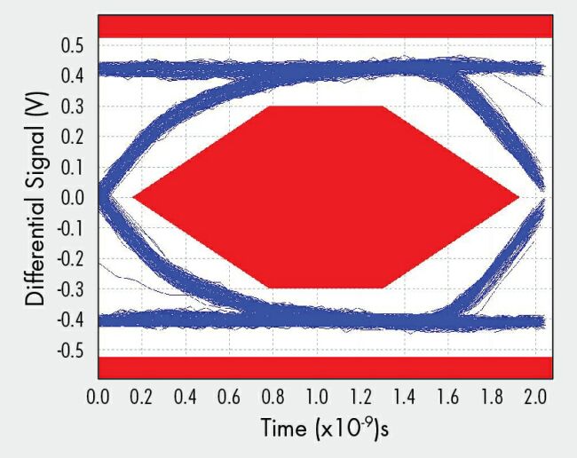 對(duì)于大多數(shù)集成電路而言,高速和低功耗一般是一對(duì)相互矛盾的特性。能夠兩者兼具的解決方案常常需要降低電壓,并使用精細(xì)的幾何工藝尺寸;然而,USB規(guī)范要求的是高電壓信號(hào)。在性能穩(wěn)健的手機(jī)設(shè)計(jì)中,D+和D-信號(hào)能夠承受至5V VBUS信號(hào)線的短路,故限制了低電壓解決方案。不過(guò),最近推出的低功耗電荷泵USB開(kāi)關(guān)解決了這個(gè)問(wèn)題,并滿足嚴(yán)苛的USB發(fā)射眼圖要求,如圖3所示。事實(shí)上,無(wú)需對(duì)架構(gòu)或所選器件做任何修改,大多數(shù)這類(lèi)設(shè)計(jì)的工作速率就能夠達(dá)到高速USB數(shù)據(jù)速率(> 1 Gbps)的兩倍以上。