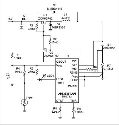 圖7所示電路是用于單節NiMH電池充電的開關模式降壓型調節器。它采用DS2712充電控制器調節充電電流和終止充電。充電控制器監視溫度、電池電壓和電池電流。如果溫度超過+45°C或者低于0°C,控制器不會對電池充電。