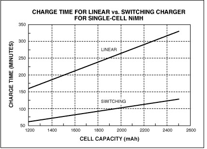 圖6. 對單節NiMH電池充電時,線性充電器和開關充電器的充電時間不同