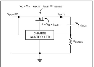 USB 2.0規范允許低功率端口提供最大100mA電流,大功率端口提供最大500mA電流。如果采用線性調整器件來調節電池充電電流,這也就是最大可提供的充電電流。線性調整器件(圖4)的功耗為P = VQ x IBATT。這會造成調整管發熱,可能需要安裝散熱器,以防止過熱。