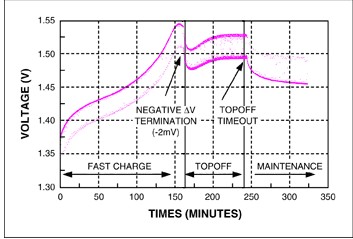 終止檢測在充電速率大于C/3時要比低充電速率時容易得多。溫度上升速率大約為1°C/分鐘,-ΔV響應也比低充電速率時更明顯。快充結束后,建議以更小的電流再充一段時間,以徹底充足電池(補足充電)。補足充電階段結束后,采用C/20或者C/30的涓充電流來補償自放電效應,使電池維持在充滿狀態。圖3所示為采用DS2712 NiMH充電器對NiMH電池(事先已充了一部分電)進行充電的電池電壓曲線。在該圖中,上面一條曲線的數據在充電電流正在灌入電池時獲得,下面那條曲線的數據在切斷電流時測得。在DS2712中,該電壓差被用來區分NiMH電池和堿性電池。如果檢測到堿性電池,則DS2712不會對它進行充電。