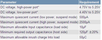 在符合USB 2.0規范的主機中,大功率端口的上游端具有120uF、低ESR電容。所連接的USB設備的輸入電容限制在10?F以內,在最初的負載連接階段,允許負載從主機(或自供電集線器)吸取的最大電荷數為50?C。這樣一來,當新設備連接至USB端口時,上游端口的瞬態電壓跌落小于0.5V。如果負載正常工作時需要更大的輸入電容,則必須提供浪涌電流限制器,以保證對更大的電容充電時電流不會超過100mA。