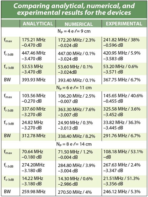 構建的第一個器件線圈匝數為4,因此傳輸線長度為9cm。圖8、9和10分別顯示了分析、數值和實驗三種情況下的頻率插損行為。表中總結了主要的參數值,包括最大幅值、-3dB頻率(fmax、fi-3dB和fs-3dB)、適當的帶寬(BW),以及相比模型值頻率偏差百分比下的各種插損結果。通過分析、數值和實驗方法獲得的結果間的偏差非常小,信號頻率最大時例外。這都是由于測量設置中噪聲和其它寄生效應造成的測試系統的局限性。在幅度基本穩定的測試頻帶上,信號電平的變化是幾乎察覺不到的,也許這就是最大信號幅度頻率的報告中出現偏差的原因。