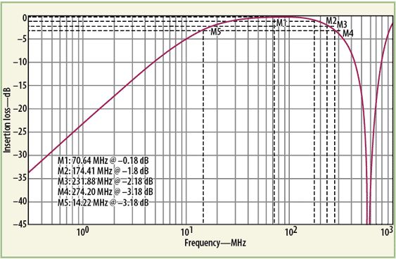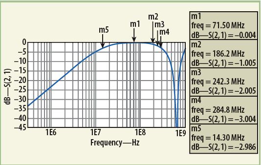 MathWorks的MATLAB數學分析軟件曾被用來分析這種變壓器器件模型的響應。分析中,把單獨的低頻(公式1)響應和高頻(公式5)響應的插損響應結合在了一起。將所需的目標值代入MATLAB公式,可獲得寬帶變壓器的最終響應。為了執行MATLAB模型數值響應的電氣仿真,使用了ADS建模軟件。該軟件有一個很有用的內部源模型,稱為XFERRUTH,其變量參數包括匝數(N)、電感因子(AL)、傳輸線特性阻抗(Z)、傳輸線電氣長度(E),以及計算傳輸線長度所需要的參考頻率(F)。