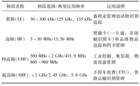 典型的RFID 系統一般由閱讀器、電子標簽、RFID 中間件及應用軟件系統3 部分組成。閱讀器與標簽建立雙向通信,通常由射頻接口、邏輯控制單元和天線3 部分組成; 標簽用于存儲所標識物品的身份和屬性信息,屬于被識別物品的標識設備,通常附著在被識別物品表面或內部,是RFID 系統的電子數據載體,由MCU、耦合線圈、整流濾波電路和自耦變壓器構成; 閱讀器能夠在讀取信息后將現存的被標識物品的信息通告給另一個系統,這個系統通常運行一種軟件,該軟件在閱讀器和應用層面之間,通常被稱為RFID 中間件。中間件是連接RFID設備和企業應用程序的紐帶,也是RFID 系統的核心,中間件將基于不同平臺、不同需求的應用環境與RFID 物理設備連接起來,并提供合適的接口使之能夠進行數據交換。根據RFID 系統中射頻信號耦合方式的不同可分為電感耦合和電磁反向散射耦合方式,電感耦合方式一般適合于中、低頻工作的近距離射頻識別系統。電磁反向散射耦合方式一般適合于特高頻、超高頻工作的長距離射頻識別系統,具體應用如表1 所示。