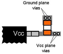 通過將電容的電源端直接連接至器件的電源端,然后經過孔連至Vcc層,在器件上安裝小容量的0.1μF或0.01μF旁路電容。經數個過孔將電容接地端連接至接地層(請參見圖6)。
