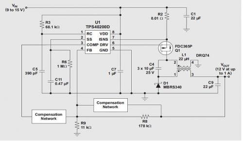 圖2使用TI TPS40200 和Coiltronics DRQ74 的ZETA 轉換器