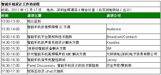 HTC、SAMSUNG、LG、SHARP、AT&T、SK Telecom、PANTECH、DoCoMo 等手機設計領軍廠商在智能市場領域的競爭非常激烈,他們都用到哪些技術?由我愛方案網(www.52solution.com)、電子元件技術網(m.sz-bosch.com)和China Outlook Consulting主辦的首屆智能手機設計工作坊(Smart Phone Design Workshop)將于2011年12月17日下午在深圳金暉酒店8樓會議室隆重召開!為您Hold 住 2012 智能趨勢,給力手機開發設計!