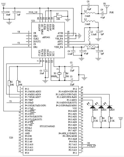 nRF2401 是一個單片無線收發(fā)一體芯片,工作在2.4GHz ISM 頻段,完全集成功率合成器、功率放大器、晶體振蕩器和調(diào)整電路。采用QFN24 5×5 毫米封裝,應(yīng)用電路使用外圍元件少(見圖2);采用FSK 調(diào)制方式,125 個頻道,能滿足多頻及跳頻需要;傳輸速率高達1Mbps,具有高數(shù)據(jù)吞吐量;功耗低,電源電壓1.9V~3.6V 滿足低功耗設(shè)計需要;芯片內(nèi)部設(shè)有專門穩(wěn)壓電路,使用各種電源包括DC/DC 開關(guān)電源均有較好的通信效果。