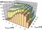 該結果的解釋需要進一步研究。現在我們可以說明,在電路板合理的電感值范圍內,漏極和源極電感必須減小,以確保高的轉換器效率。該仿真得出如下結果: