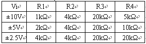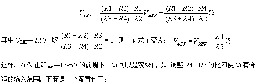 ADS7864模擬輸入通道的+IN和-IN的最大電壓輸入范圍為-0.3V~+5.3V(ADS7864 +5V供電)。圖3的電路中使用了2個運放,A1用作跟隨器,用來緩沖ADS7864輸出的2.5V基準電壓源;A2和四個電阻構成了信號調理網絡,適當配置R1~R4電阻可以實現對輸入信號Vi的縮放和平移以適合ADS7864模擬通道的輸入要求。+IN端的輸入電壓表示如下: