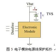 車載模塊的電源線保護(hù)是在汽車環(huán)境中需要關(guān)注的另一個問題,這個問題涉及ISO7637-2標(biāo)準(zhǔn)。例如,為滿足ISO7637-2標(biāo)準(zhǔn),特別是圖1中的1、2、3a和3b的脈沖要求,只使用一個瞬變電壓抑制器(TVS)即可有效保護(hù)車載模塊。