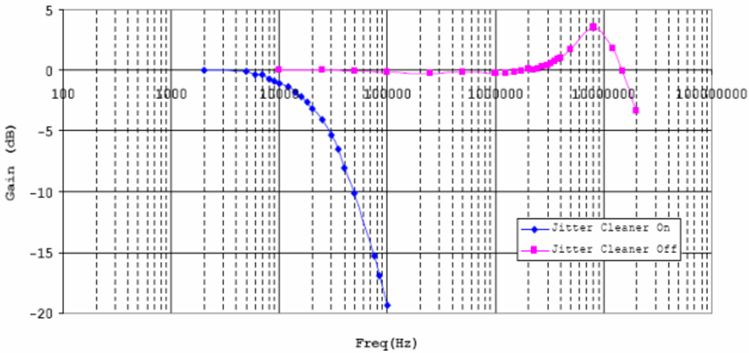 2)由于串并模塊里的高頻倍頻器環路帶寬很大,最大可達30MHz左右。故TLK3132內部集成了一顆基于LC振蕩器的抖動濾除鎖相環,環路帶寬通常設置在幾百KHz以內,可以對輸入參考時鐘進行濾除,降低參考時鐘對幾百KHz 以上抖動性能的要求,圖6是TLK3132發送鏈路在抖動濾除器打開和關閉下的環路傳遞函數。此外,抖動濾除器也可對鏈路恢復的時鐘(只可接收CH0通道的恢復時鐘RXBCLK(0))進行抖動濾除,提高恢復時鐘的信號質量。