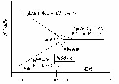近場(near field)(磁和電的成份)和遠場的關系,如附圖一所示。所有的波都是磁場和電場成份的組合。這種組合稱作「Poynting向量」。實際上,是沒有一個單獨的電波或磁波存在的。我們之所以能夠測量到平面波,是因為對一個小天線而言,在距離來源端數個波長的地方,其波前(wavefront)看起來像平面一樣。