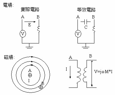 就Maxwell方程式的大多數應用而言,噪聲耦合方法可以代表等效組件的模型。例如:在兩個導體之間的一個時變電場,可以代表一個電容。在相同的兩導體之間,一個時變磁場可以代表互感(mutual inductance)。附圖二表示這兩種噪聲耦合機制。