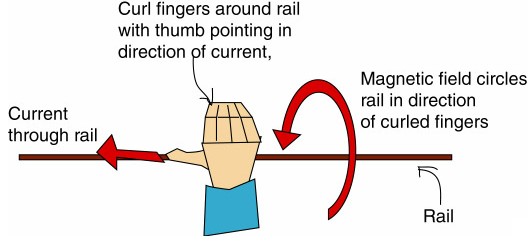 根據Maxwell方程式,移動走線中的電荷可以產生一電流,此電流又會產生一磁場,這種被移動電荷產生的磁場稱作「磁通線(magnetic lines of flux)」。使用「右手法則(Right-Hand Rule)」可以輕易地指出磁通線的方向,如附圖四所示。右手拇指代表走線電流流動的方向,其余卷曲的手指包圍著走線,代表磁場或磁通線的方向。此外,時變磁場會產生一個垂直的電場。射頻輻射是此磁場和電場的組合。藉由輻射或導電的方式,磁場和電場會離開PCB結構。