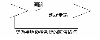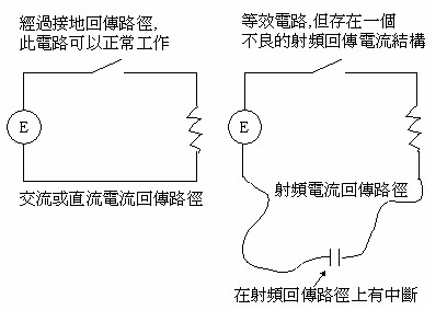 如附圖六所示,一個開關和來源驅動端(E)串聯。當開關關閉時,電路按照期望結果正常工作;當開關開啟時,則不具任何功能。對時域而言,期望訊號從來源端到達負載。此訊號必須具有一個回傳路徑,才能使此電路成立,這通常是經過一個0V(接地)的回傳結構(Kirchhoff定律)。射頻電流的流動是從來源端到達負載,而且必須經過阻抗盡可能最小的路徑返回,通常它是經過一個接地走線或接地平面(鏡射平面)。射頻電流的存在,最好使用Ampere定律來說明。