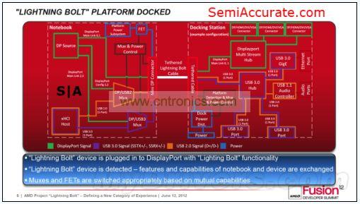 從硬件層面上看,Lightning Bolt其實(shí)很簡單,驅(qū)動(dòng)級的硬件兼容性使得芯片上的USB通道及APU上的DP通道用一條線纜就可以連接起來并輸出到hub上。