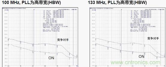 另外,多個(gè)PLL分層布置時(shí),用戶可調(diào)節(jié)帶寬對(duì)時(shí)鐘樹進(jìn)行系統(tǒng)優(yōu)化。使用HBW(高帶寬)擴(kuò)頻時(shí)鐘時(shí)用于維持?jǐn)U頻特性,從而將輸入與輸出相位差減至最小;使用LBW (低帶寬)可濾除PLL帶寬內(nèi)的時(shí)鐘輸入抖動(dòng)。