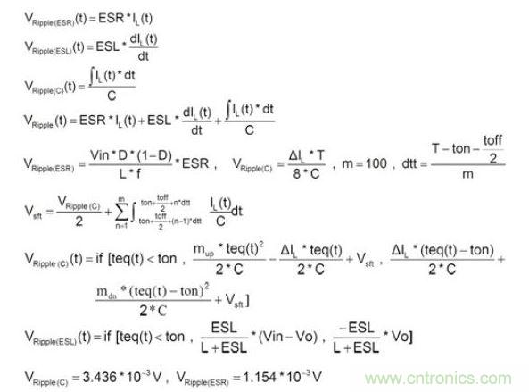 一般而言,在穩態(Steady State)及負載固定時,輸出電容的紋波電壓主要是由電感的紋波電流造成,可先計算出電感的紋波電流,再利用歐姆定律,電感微分公式及電容電荷儲存公式,分別計算出ESR、ESL及Capacitance的紋波電壓。再將此三種紋波加總起來,便可得輸出電容的紋波電壓,如公式1所示: