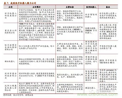 隨著醫(yī)用機(jī)器人技術(shù)的不斷突破和發(fā)展,從2005年開(kāi)始我國(guó)有一批重點(diǎn)高校科研醫(yī)院?jiǎn)挝患把芯克谘芯酷t(yī)用機(jī)器人系統(tǒng)并取得了一些小成就,比如哈工大的微創(chuàng)腹腔外科手術(shù)機(jī)器已經(jīng)成功被專(zhuān)家驗(yàn)收,天津大學(xué)的妙手機(jī)器人在今年3月份開(kāi)始臨床使用;同時(shí),隨著醫(yī)用機(jī)器人商業(yè)化市場(chǎng)化的可能性愈發(fā)明晰,已經(jīng)有部分企業(yè)正在生產(chǎn)或者打算進(jìn)軍醫(yī)用機(jī)器人細(xì)分行業(yè),其中就包括機(jī)器人領(lǐng)先企業(yè)的博實(shí)股份和新松機(jī)器人。