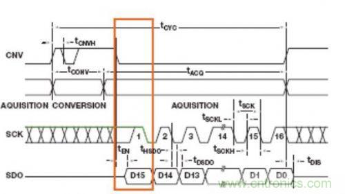公司帶SPI接口的許多SAR ADC都是從CS或CNV的下降沿為MSB提供時鐘信號,剩余的數據位則跟隨SCLK的下降沿,如圖3所示。在讀取MSB數據時,要使用等式中的tEN而非tDRV。