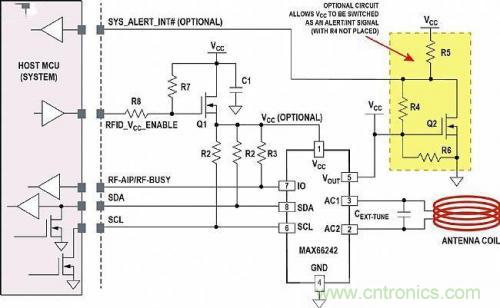 在設(shè)備原理圖中利用該電路(圖4)的各種變型,OEM產(chǎn)品可與任何NFC/RFID讀卡器或發(fā)起方系統(tǒng)進(jìn)行通信。一旦電路板進(jìn)入HF場,VOUT升高并導(dǎo)通Q2。開漏信號SYS_ALERT_INT#變?yōu)榈碗娖剑袛嗷騿拘阎鳈C(jī)微控制器,由此表示系統(tǒng)處于HF場中。然后主機(jī)微控制器將RFID_VCC_ANABLE驅(qū)動(dòng)為邏輯高狀態(tài),將MOSFET Q1導(dǎo)通。此時(shí),主機(jī)微控制器即可與產(chǎn)生HF場的NFC/RFID讀卡器交換數(shù)據(jù)。同樣,MAX66242的VCC引腳不需要連接電源,因?yàn)镮C的內(nèi)部電路由從HF場收集的能量供電。然而,VCC引腳如圖4所示連接,所以主機(jī)微控制器能夠在沒有HF場的情況下訪問IC。就像有線至無線轉(zhuǎn)換器一樣,I?C信號將數(shù)據(jù)傳輸至外部。數(shù)據(jù)流由RF-AIP (RF-Access-In-Progress)引腳控制,也與RF-BUSY引腳多路復(fù)用。