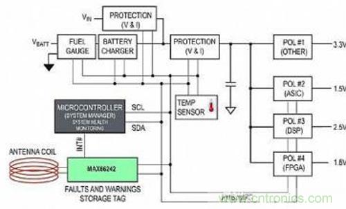 設(shè)計(jì)者可利用MAX66242儲(chǔ)存對系統(tǒng)運(yùn)行至關(guān)重要的診斷和故障數(shù)據(jù)。在系統(tǒng)“死機(jī)”后或未上電時(shí),可上傳該數(shù)據(jù)。這種系統(tǒng)健康和故障數(shù)據(jù)的收集是通過NFC/RFID標(biāo)簽的接口實(shí)現(xiàn)的。圖7所示為典型的電源管理系統(tǒng),其中每個(gè)負(fù)載點(diǎn)(POL)穩(wěn)壓器由公共電源管理總線(PMBus)進(jìn)行配置和監(jiān)測。PMBus僅僅是I?C總線的一種變體。系統(tǒng)正常工作期間,持續(xù)監(jiān)測每個(gè)POL的關(guān)鍵工作參數(shù)。在持續(xù)監(jiān)測模式下,系統(tǒng)管理器也可執(zhí)行修正措施,以響應(yīng)故障或工作報(bào)警。
