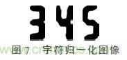 得到字符在圖像中的位置后,即可將字符從圖像中分割出來。由于實際分割過程中每個字符大小不一致,如圖6所示,所以對分割字符進行歸一化處理,使不同字符的大小統(tǒng)一為固定大小,便于后續(xù)字符分割。首先將圖6中字符周圍的空白位置切除,然后采用三次樣條插值的方法,對源圖像附近的4×4個鄰近像素進行三次樣條擬合,最后將目標(biāo)像素對應(yīng)的三次樣條值作為目標(biāo)圖像對應(yīng)像素點的值。將字符歸一化以后,所得各個字符如下圖7所示。