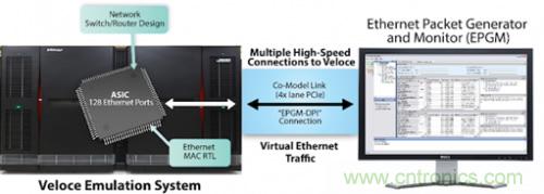 擁有成百上千個(gè)端口的設(shè)計(jì)需要與硬件擁有非常多的連接,而這些連接全都需要接線(xiàn)纜,這就使得在 ICE 環(huán)境中驗(yàn)證網(wǎng)絡(luò)交換機(jī)和路由器設(shè)計(jì)不再可行。此外,一個(gè)128 端口的以太網(wǎng)設(shè)計(jì)等可能具有數(shù)億甚至數(shù)十億個(gè)門(mén)的尺寸。