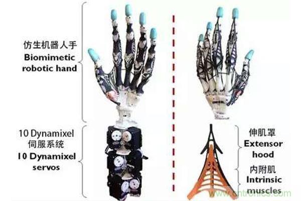 關(guān)節(jié)韌帶(身體用來(lái)固定關(guān)節(jié)且控制它們活動(dòng)范圍的部分)的材料使用了高強(qiáng)度的Spectra帶,并帶有激光切割的橡膠板來(lái)代替增加關(guān)節(jié)依從性的軟組織。伸肌和屈肌的肌腱(用來(lái)矯直和彎曲手指的部分)也由Spectra帶構(gòu)成,同時(shí)用更多的激光切割橡膠板代替了腱鞘和伸肌腱帽,后者是通過(guò)包裹手指來(lái)使其應(yīng)對(duì)靈活性和扭矩的復(fù)雜的蹼狀多層結(jié)構(gòu)。UW(華盛頓大學(xué)縮寫(xiě))手的最后一部分構(gòu)成是肌肉,它是由一排10個(gè)Dynamixel伺服系統(tǒng)組成,它們的電纜布線也緊密的模仿了人手的腕隧道。