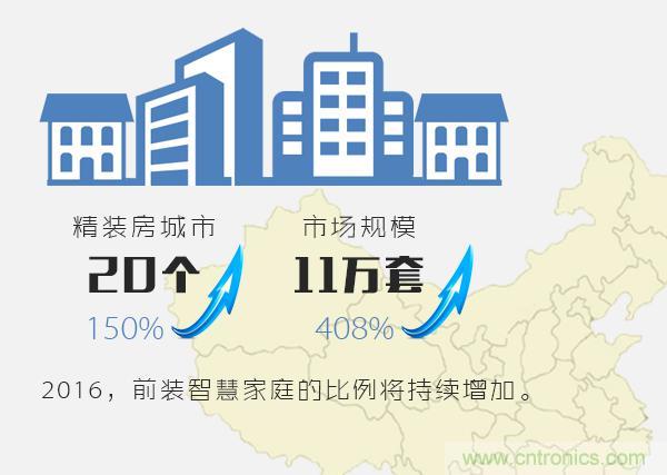 2015年各大地產(chǎn)商和物業(yè)公司都在推出智慧家庭和智慧社區(qū)的產(chǎn)品或樣板,包括花樣年、招商地產(chǎn)、金地物業(yè)、保利地產(chǎn)、萬科等。據(jù)奧維數(shù)據(jù)顯示,2015年有智能精裝房的城市達(dá)到20個(gè),同比增長150%;市場規(guī)模達(dá)到11萬套,同比增長408%。2016年面對低迷的樓市,為了維持房價(jià),商品房中前裝智慧家庭的比例還會(huì)增加。