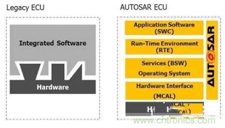 就本質而言,AUTOSAR提供標準的ECU接口定義,使設計人員能夠具體指定每個汽車ECU中都需要的可重復使用之標準化軟件層和組件。該標準不受硬件的影響,這意味著應用軟件和硬件平臺是相互獨立的。應用軟件開發人員可在應用軟件中明確地說明各個汽車功能的細節,而不用擔心相關軟件服務和硬件接口。過去,軟件和硬件緊密地整合在一起,因此很難實現可移植性和可重復使用(圖1)。