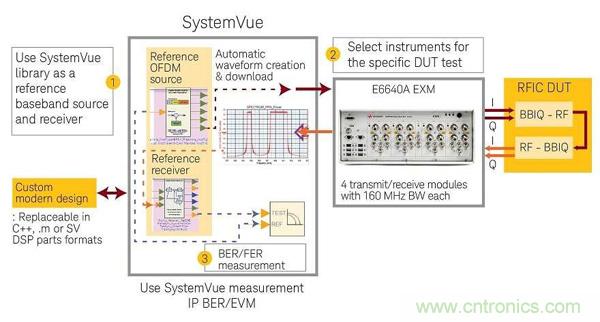 圖1:圖中顯示初期的802.11ax裝置評估流程圖。流程的核心是Keysight systemVue ESL軟體,它具有強大的功能及靈活性,可解決與802.11ax裝置設計和測試相關的挑戰。藉由SystemVue,在標準草案階段所開發出的IP,可快速連接到各種儀器進行設計驗證測試。