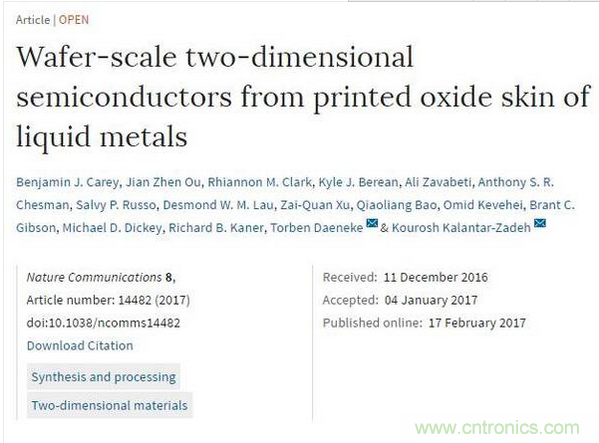 描述了這一新技術(shù)的論文“Wafer Scale Two Dimensional Semiconductors from Printed Oxide Skin of Liquid Metals”已經(jīng)在 Nature Communications 雜志上發(fā)表。