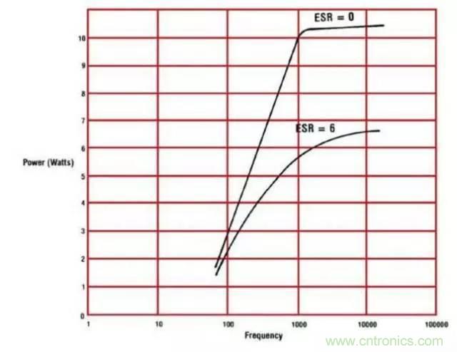 下圖是兩個100微法電容(ESR分別為0和6歐姆)時其輸出功率隨輸出頻率變化的曲線。