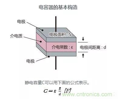 普通電容器由2枚電極(金屬板)和中間夾著的介電質組成。一旦施加電壓,電子就聚集在一個電極上,是儲存電荷的狀態。此時電極間的介電質通過「介電分極」現象,發揮增加靜電容量的作用。