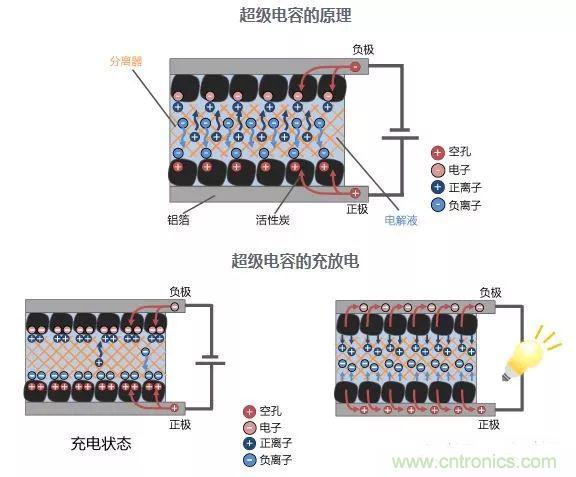 超級電容也是同樣的基本原理,與普通電容不同的是,電極間是用電解液而不是介電質填充。施加電壓的話,電極和電解液的面呈現正負電荷排列,形成稱為「電氣雙層」的層,在此出存儲電荷。超級電容的靜電容量與電氣雙層的面積成正比,為了盡可能地使該面積變大,在電極上使用活性炭?;钚蕴康谋砻嬗性S多開放的孔,這是為了實際獲得最大的表面積。