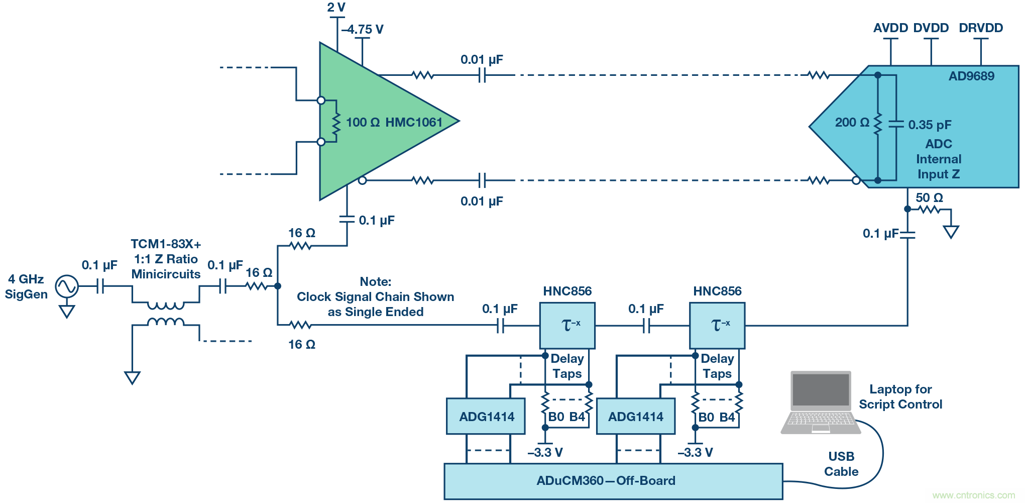 在電路板上完成該過程可能冗長乏味,因為紙面分析可能不會考慮PCB板上時鐘走線傳播間隔造成的相應(yīng)延遲,內(nèi)部器件組延遲,ADC孔徑延遲,以及將時鐘分為兩個不同段所涉及到的相關(guān)電路(一條時鐘走線用于THA,另一條時鐘走線用于ADC)。設(shè)置THA和ADC之間延遲的一種方法是使用可變延遲線。這些器件可以是有源或無源的,目的是正確對準(zhǔn)THA采樣過程的時間并將其交給ADC進行采樣。這保證了ADC對THA輸出波形的穩(wěn)定保持模式部分進行采樣,從而準(zhǔn)確表示輸入信號。