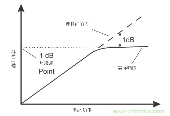 第二種規格,輸出1dB壓縮點,實際上非常類似于最大線性輸出電壓和電流的概念。它也被稱為P1dB,在該點上,放大器從理想狀態下增益壓縮到1分貝的輸出功率級。圖1介紹了該概念,其中,實線表示測得的信號,虛線表示理想的信號。有時,一些測量將P1dB點與輸入而非輸出對照,這應在計算中予以考慮。