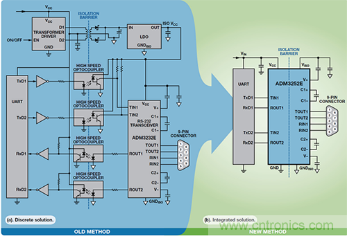 圖 5. 隔離式 RS-232 設計比較