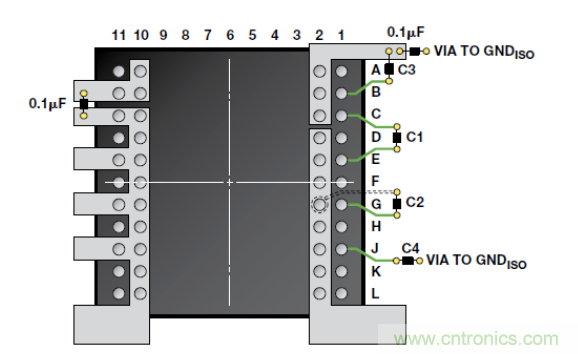 圖 7. ADM3252E 推薦的印刷電路板布局