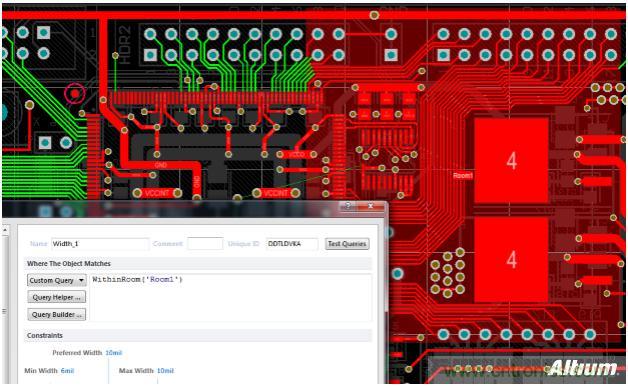 在Room里框選出一定區(qū)域后,不僅僅是可以單獨(dú)設(shè)置線寬規(guī)則,還可以對(duì)它設(shè)置PCB Rule規(guī)則定義頁(yè)面上的任意規(guī)則。