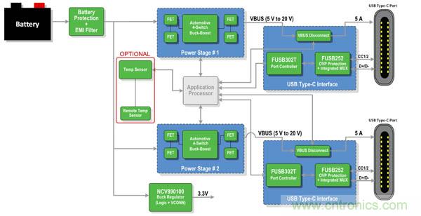 安森美半導(dǎo)體的FUSB302B是完全符合AEC-Q100車規(guī)的可編程的USB Type-C控制器,含電源傳輸,集成了一個(gè)BMC客戶端配置通道,支持全Type-C PD 2.0 的1.1版本。這意味著CC可用于檢測(cè)設(shè)備何時(shí)連接或未連接、主機(jī)或設(shè)備的當(dāng)前功能,以及是否存在有源電纜,以及選擇所需的模式(如音頻適配器或調(diào)試附件模式)。圖1顯示了一個(gè)典型應(yīng)用的框圖。