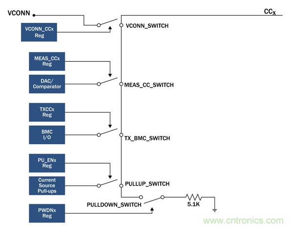 FUSB302B實(shí)施了一個(gè)CC開關(guān),使它能夠檢測(cè)到它是作為設(shè)備主機(jī)還是雙角色端口連接,通過(guò)多個(gè)比較器和由主機(jī)處理器上的軟件控制的可編程DAC進(jìn)行管理(圖3)。