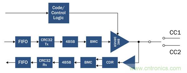 Type-C連接可正反逆插,為用戶帶來(lái)了更多的便利,卻使開發(fā)更復(fù)雜。方向通過(guò)新的配置通道(CC)管理,該配置通道在連接器上有兩個(gè)專用的引腳,并支持連接的設(shè)備協(xié)商需要提供或汲取多少電源。該通道使用的協(xié)議是一種稱為雙相符號(hào)編碼(BMC)的差分曼徹斯特編碼。USB Implementer Forum(USB-IF)定義了五個(gè)供電配置文件:10W、18W、36W、60W和100 W。使用BMC協(xié)議,電源配置文件可在含USB Type-C接口的兩臺(tái)設(shè)備之間進(jìn)行交換。編碼方案使用轉(zhuǎn)換來(lái)表示邏輯電平,而不是絕對(duì)電平,并且它結(jié)合了自己的時(shí)鐘信號(hào),使得同步更簡(jiǎn)單。然而,BMC協(xié)議依賴于一個(gè)物理接口,該接口能在具電氣挑戰(zhàn)的環(huán)境中可靠地解碼信號(hào),而且很少有電氣環(huán)境比車輛環(huán)境更具挑戰(zhàn)性。