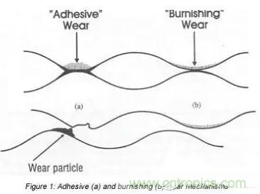 在(b)處較弱的界面可能在原始界面處或附近斷裂,很少發生磨損。(a)處的磨損過程通常稱為粘著磨損,(b)處的磨損過程稱為拋光磨損。如果在放大鏡下觀察連接器咬合過程中產生的磨損軌跡,在30~50倍放大時,粘著磨損軌跡將顯示出磨損顆粒的跡象,并顯得有些粗糙,而拋光磨損軌跡將顯得光滑和光亮。