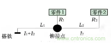 R1—零件1的電阻, L1—鉚接點到搭鐵點的導(dǎo)線電阻, R2—零件2的電阻,L2—零件2到鉚接點的導(dǎo)線電阻