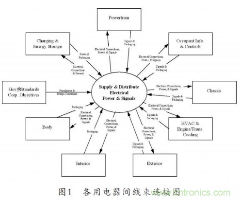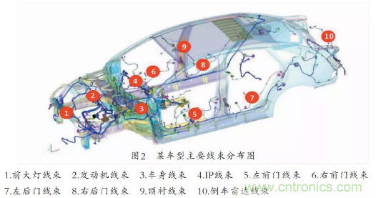 線束是汽車的神經(jīng)網(wǎng)絡(luò)系統(tǒng),在整車的運(yùn)行中傳遞電壓、信號及大量的數(shù)據(jù),圖1為各用電器線束連接示意圖。特別是在互聯(lián)網(wǎng)、大數(shù)據(jù)背景下,這就要求線束載體不僅僅起到通斷作用,對數(shù)據(jù)的傳輸速率及響應(yīng)能力提出了更高的要求,同時由于線束的物理布置空間有限,對其失效性和售后返修帶來更大挑戰(zhàn)。